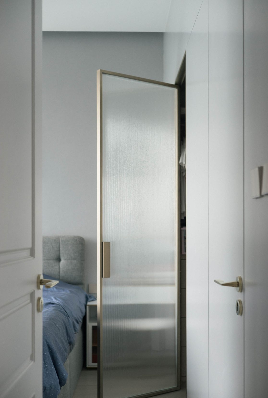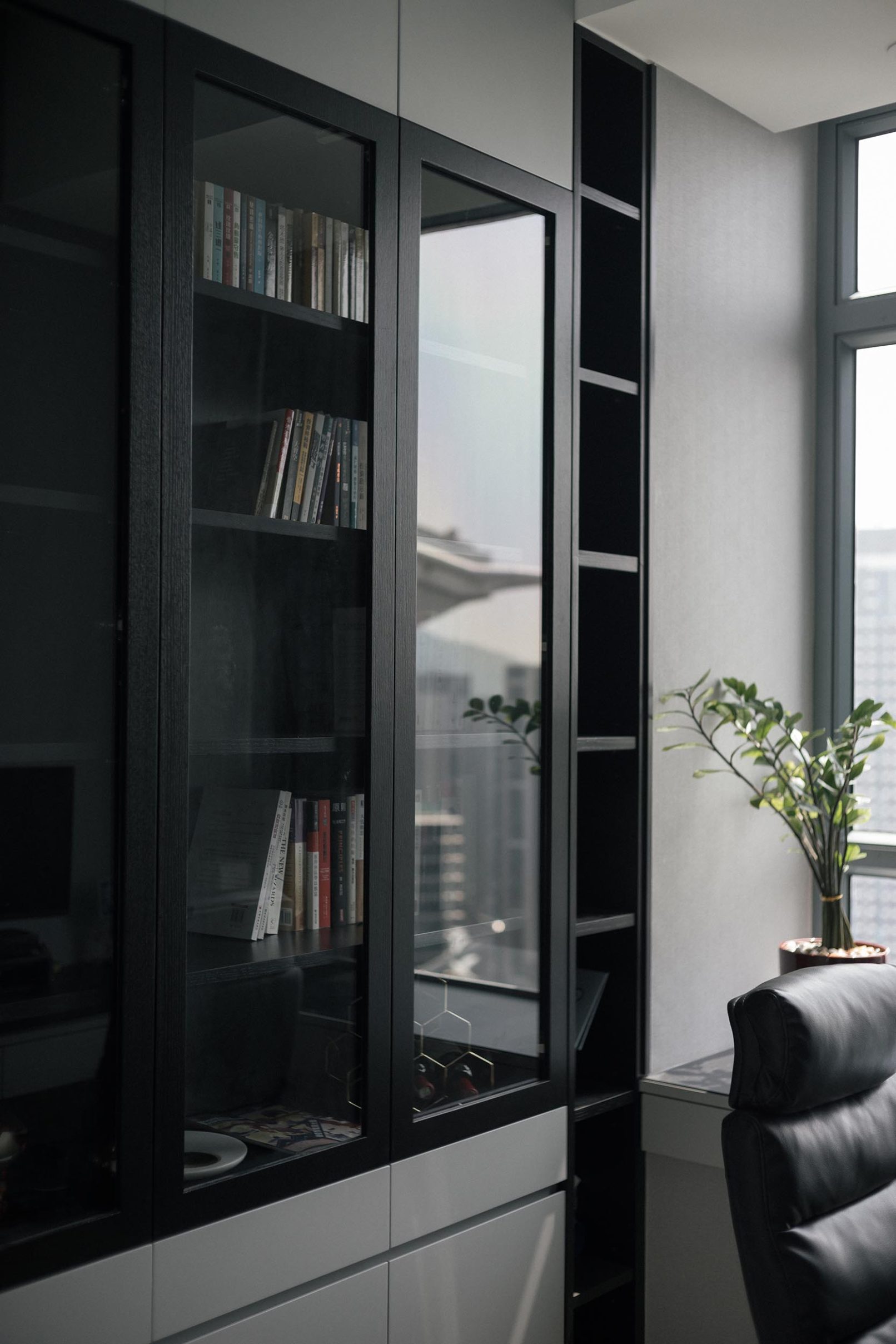 The two rooms in the home are used as a study, catering to the increasing demand for working from home. The male study features black wood and gray design, while the female study uses light colors and metallic elements to create a feminine and elegant feel. The master bedroom features a wallpaper design, with a special wall, concealed door, and metallic door frame for the ensuite and walk-in closet.