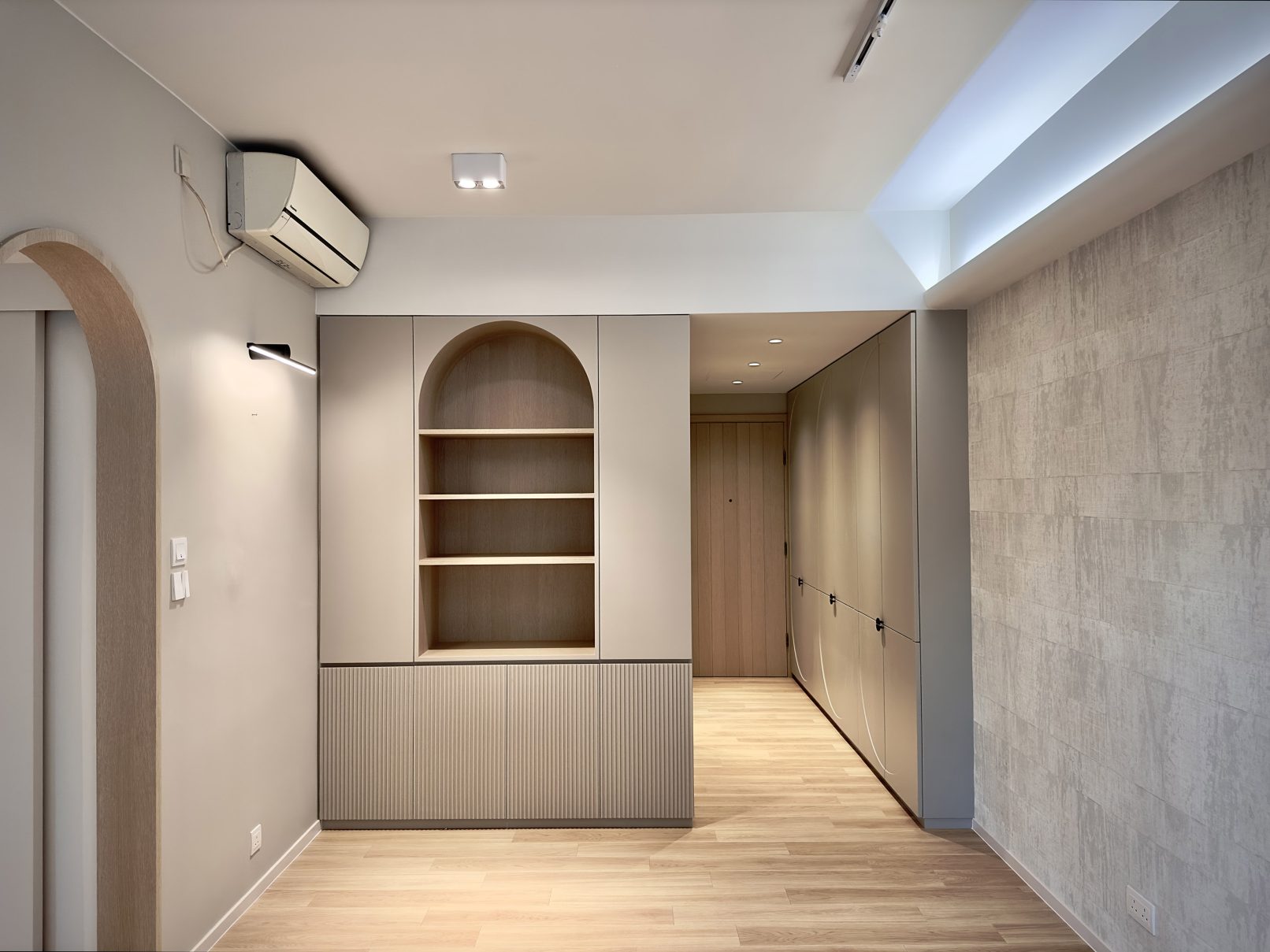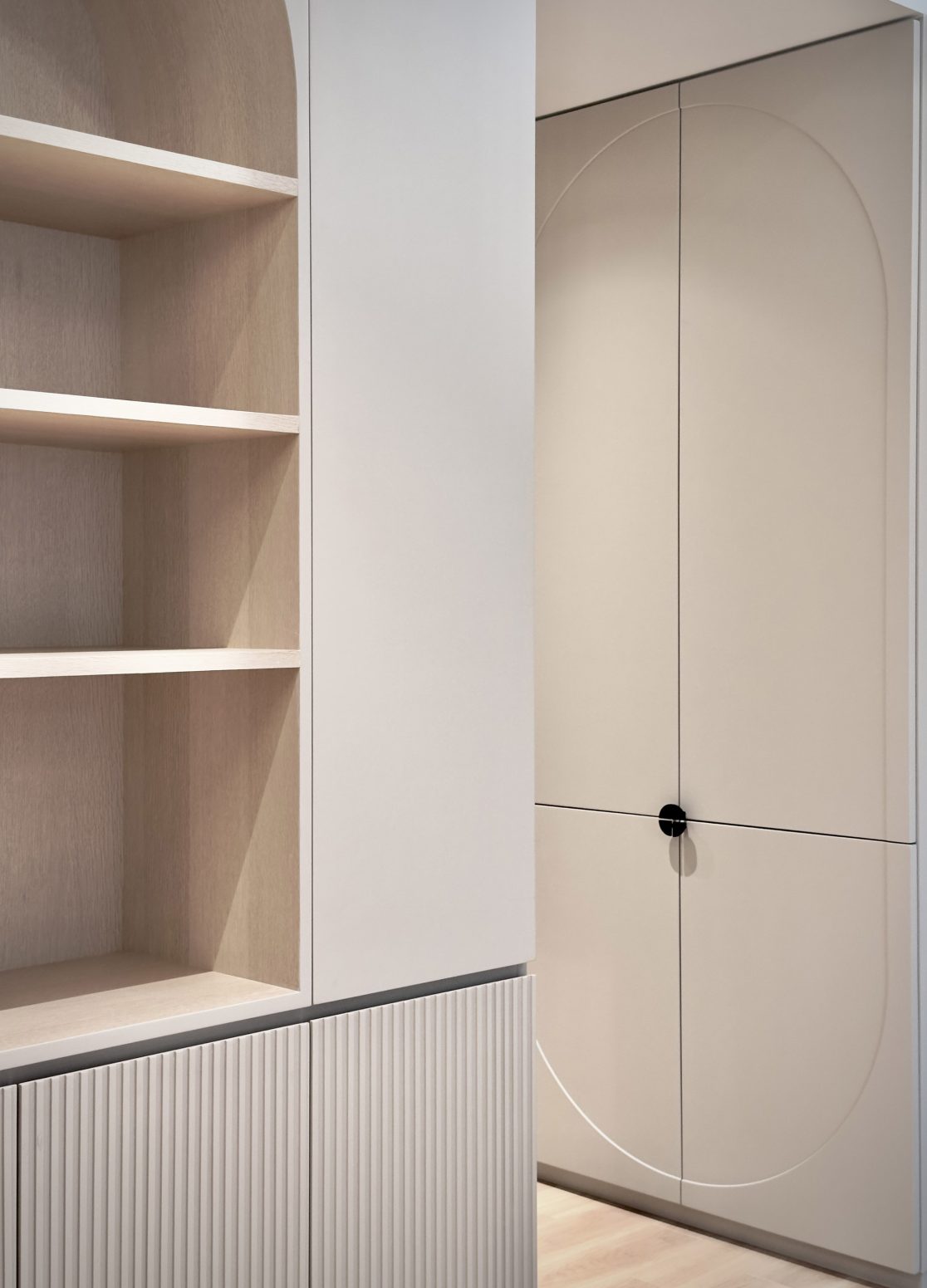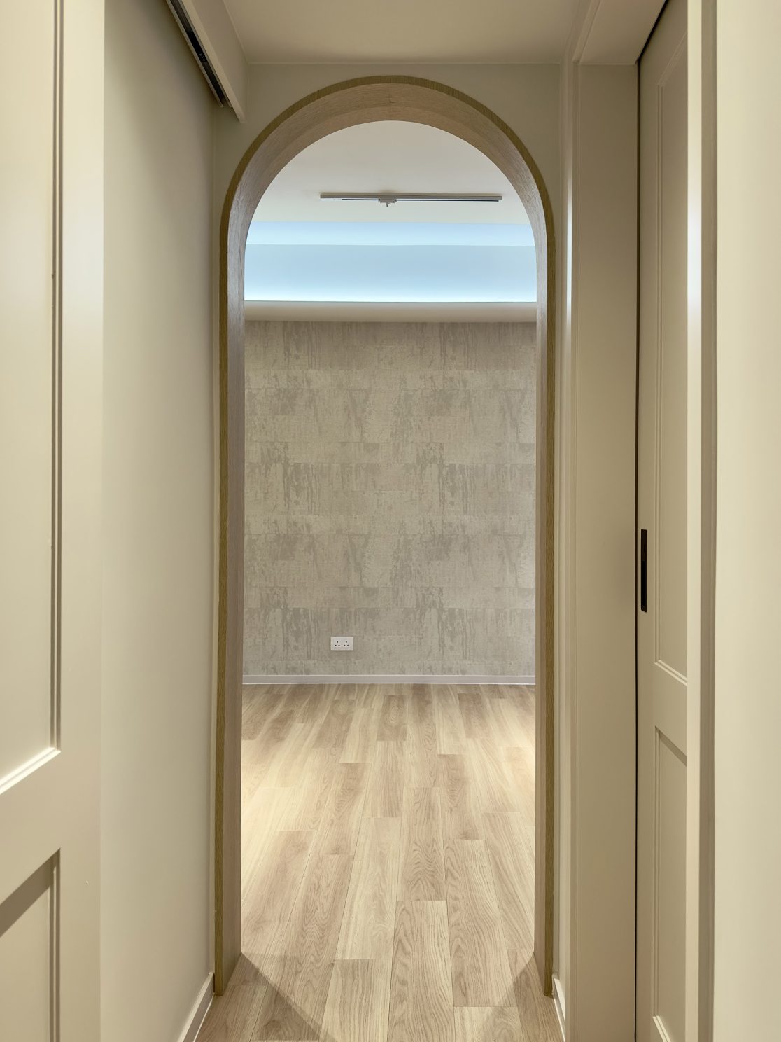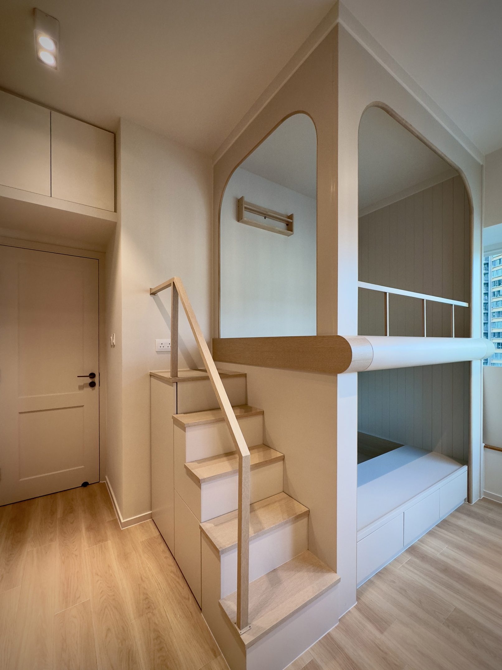 This 580 sq. ft. residence in Tsuen Wan is designed with a creamy aesthetic style, catering to a family of four. The extensive use of curved lines throughout the spaces creates a seamless visual effect, adding a sense of fluidity.