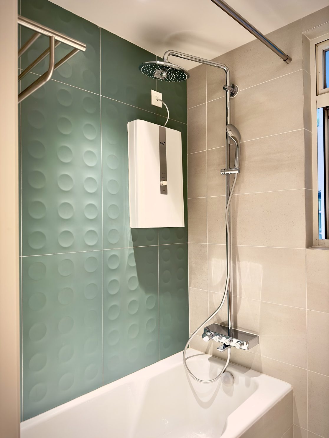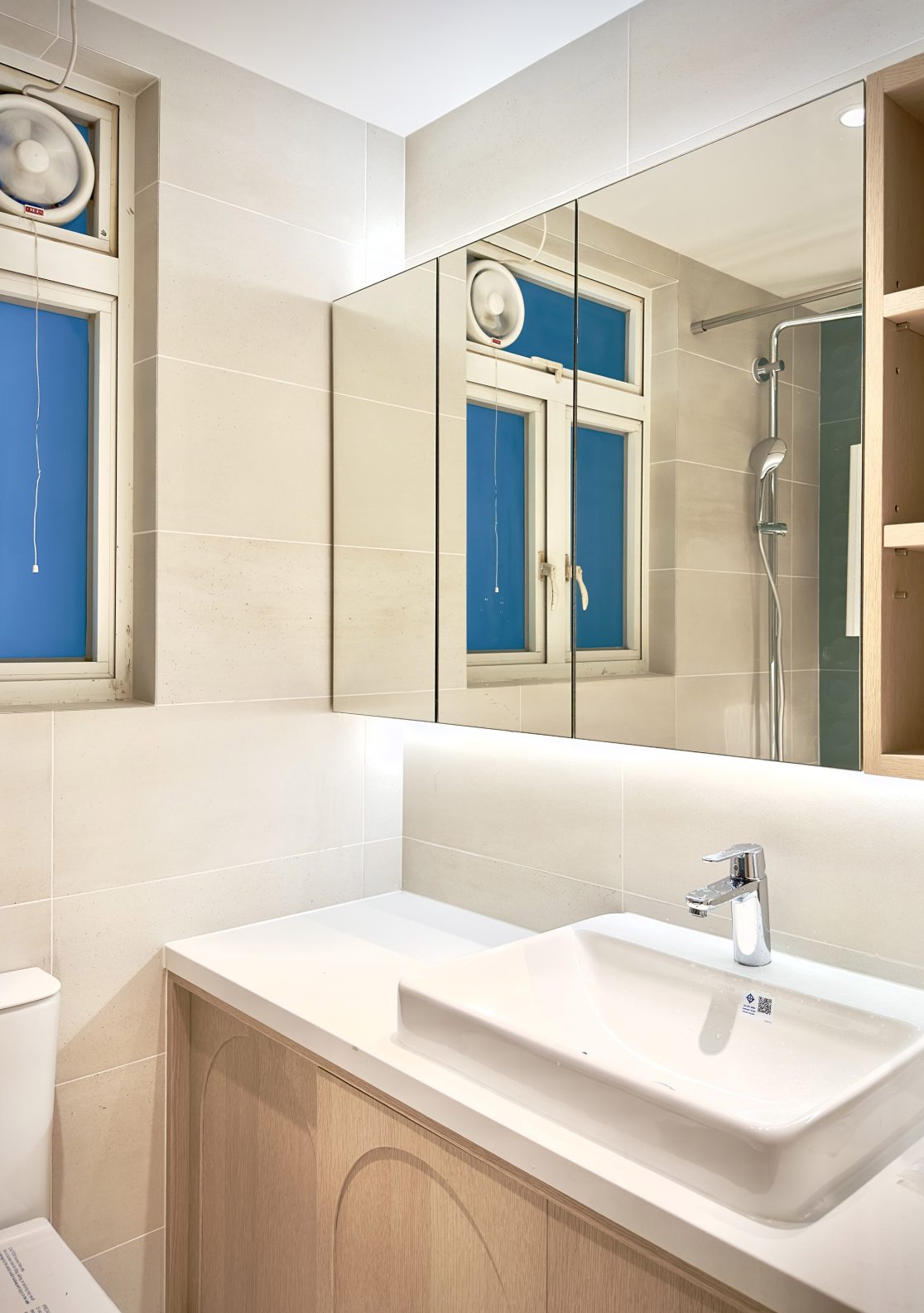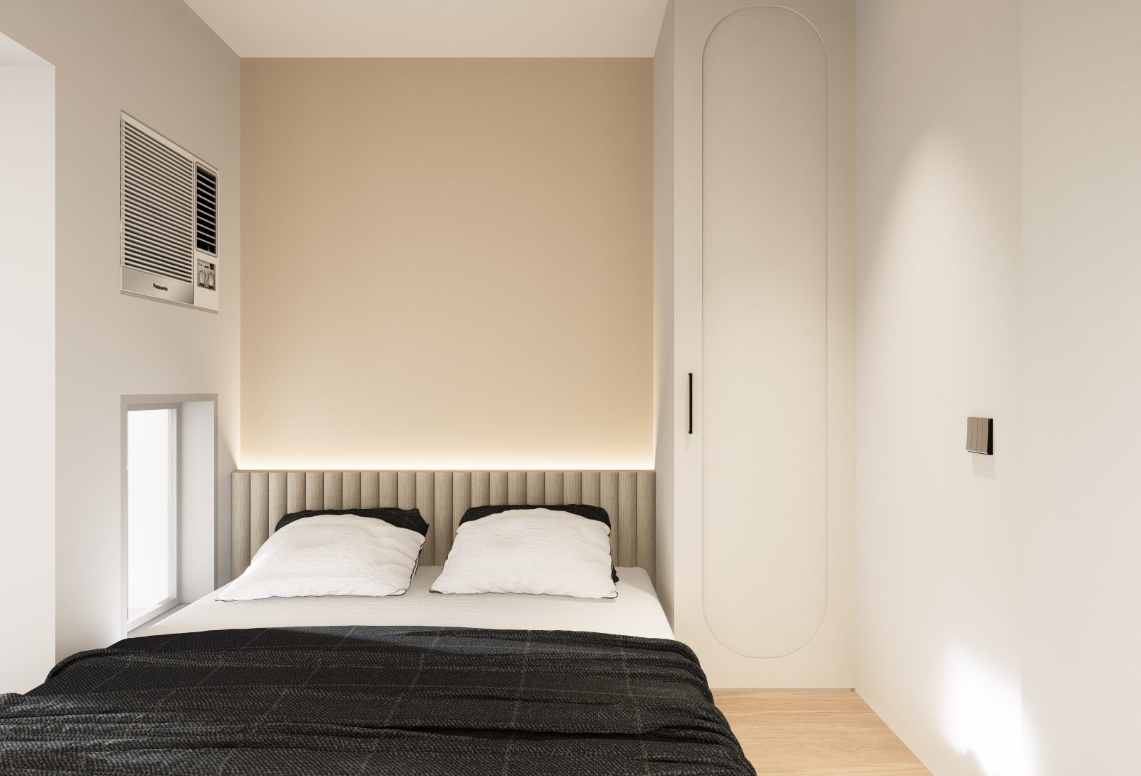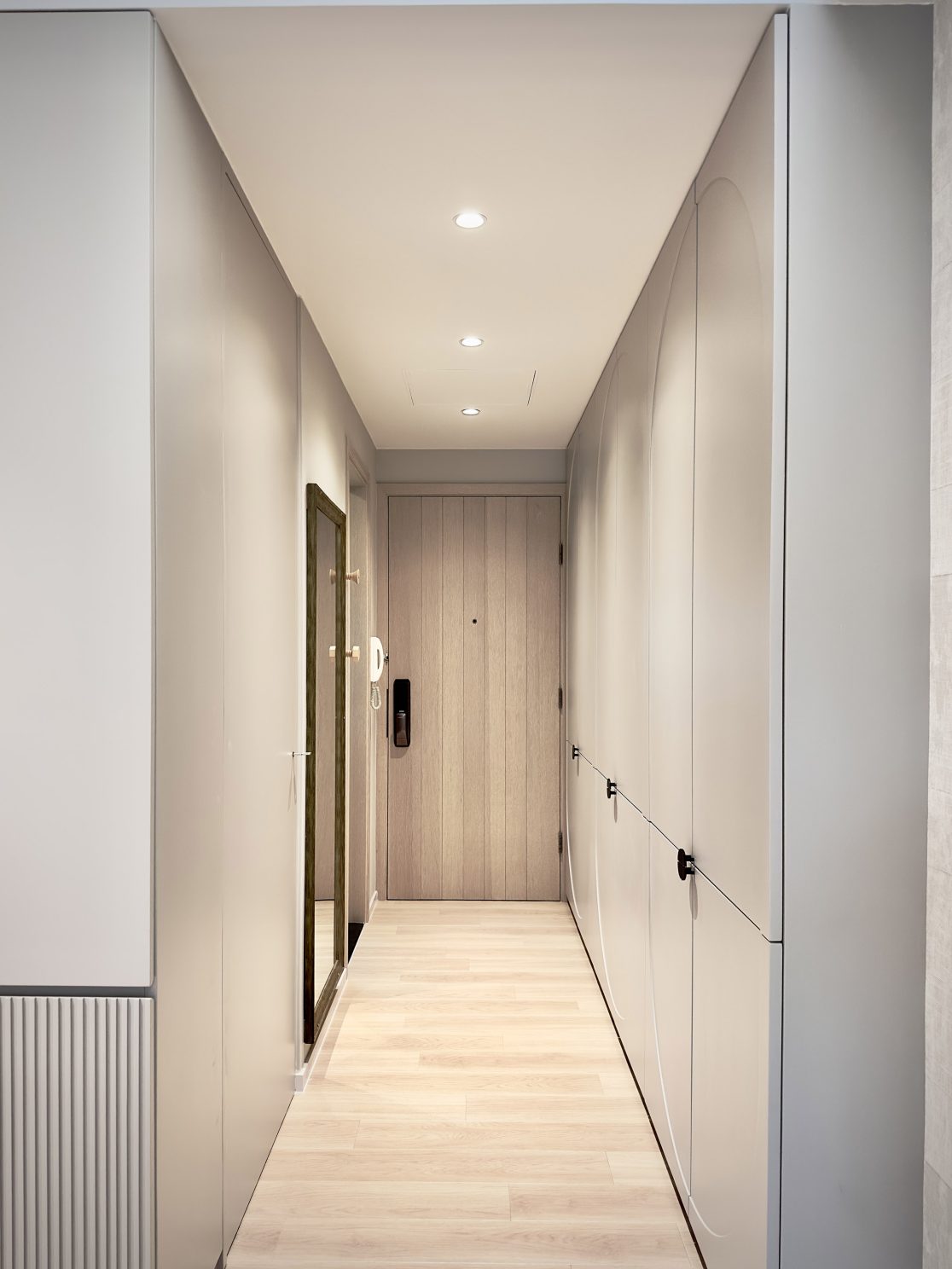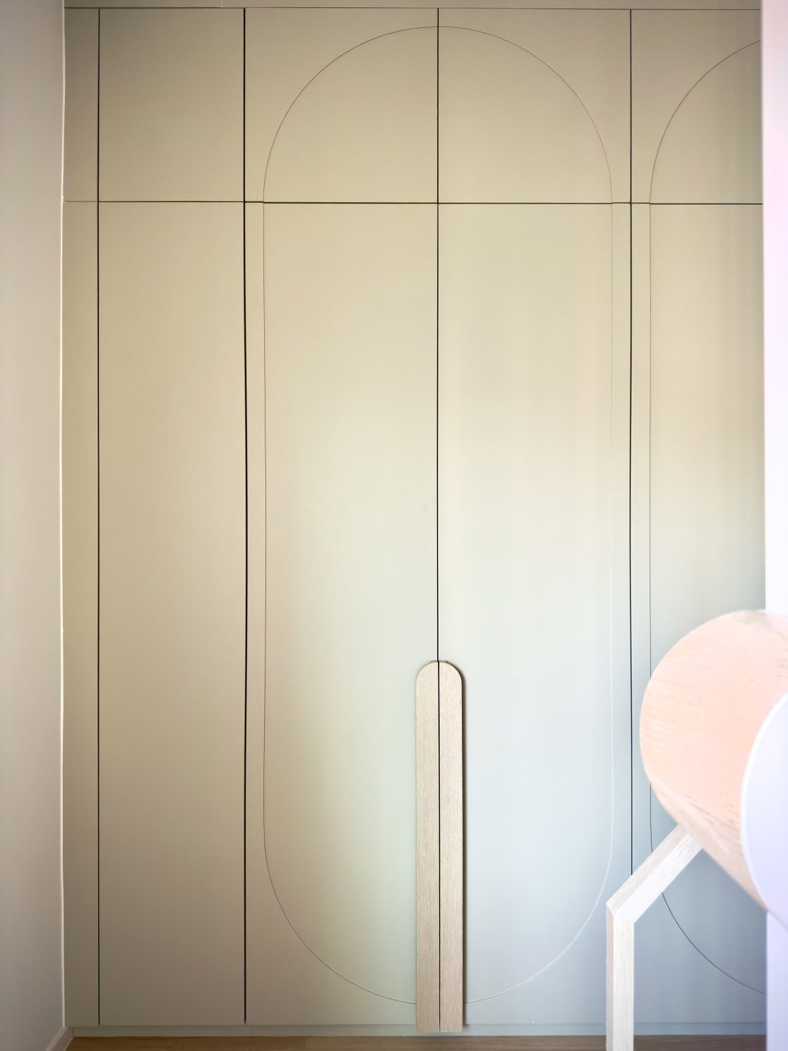 This 580 sq. ft. residence in Tsuen Wan is designed with a creamy aesthetic style, catering to a family of four. The extensive use of curved lines throughout the spaces creates a seamless visual effect, adding a sense of fluidity.