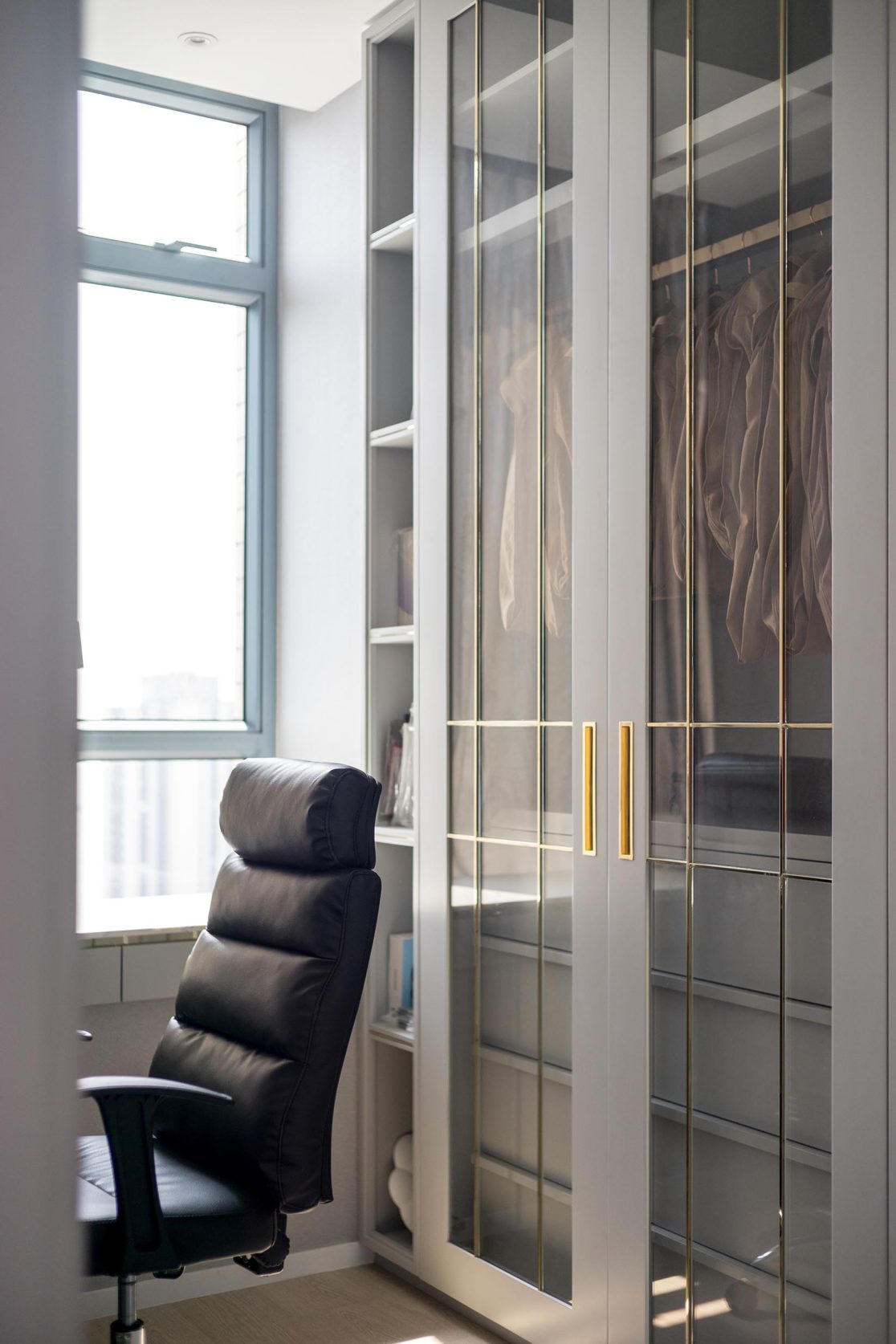 The two rooms in the home are used as a study, catering to the increasing demand for working from home. The male study features black wood and gray design, while the female study uses light colors and metallic elements to create a feminine and elegant feel. The master bedroom features a wallpaper design, with a special wall, concealed door, and metallic door frame for the ensuite and walk-in closet.
